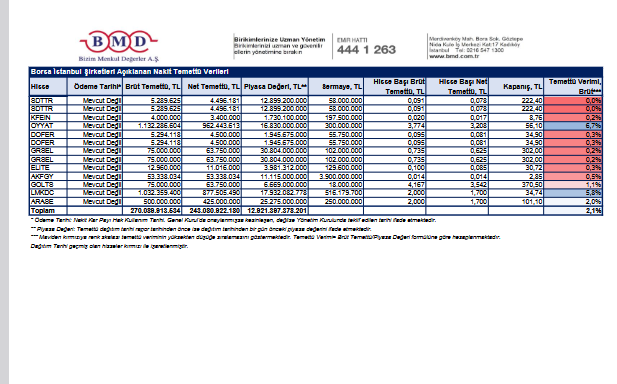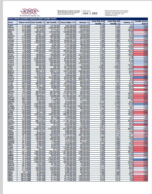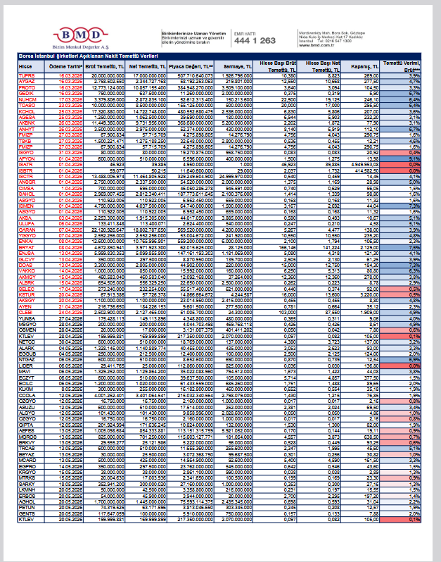 Bizim Menkul Değerler (BMD) Araştırma’nın yayımladığı raporda, Borsa İstanbul’da işlem gören ve 2025 yılı karından temettü dağıtımına yönelik yönetim kurulu kararı bulunan şirketlere ilişkin nakit temettü tutarları, ödeme tarihleri ve temettü verilerine yer verildi.