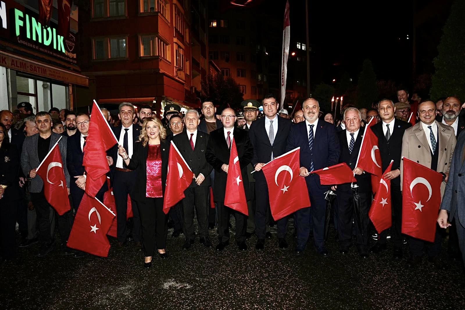 Giresun Belediyesi bandosu eşliğinde ellerinde Türk bayrakları ve meşalelerle yürüyen Giresunlular, söyledikleri marşlar ve sloganlar eşliğinde Cumhuriyet’in 102. kuruluş yıl dönümünü kutladı. Vatandaşlar ise, evlerinden ve iş yerlerinden korteje alkışlarla destek verdi.