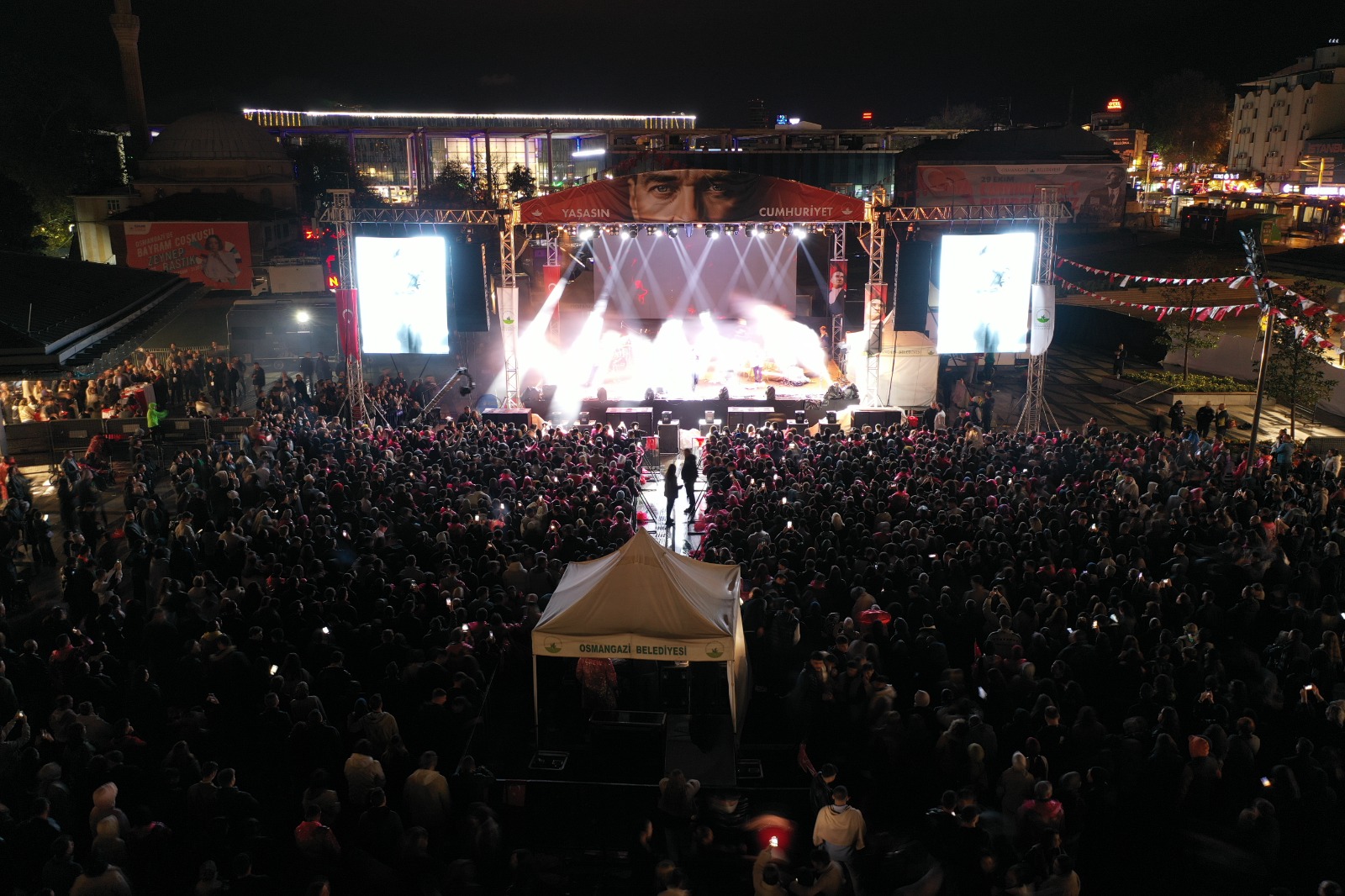 Konseri vatandaşlarla birlikte izleyen Osmangazi Belediye Başkanı Erkan Aydın, “Burada Cumhuriyetine sahip çıkan, geleceğine umutla bakan, asla geri adım atmayan gençleri görüyorum. Gökyüzü ağlamadan gökkuşağı görülmez. Güzel günler çok yakın. Bugünleri hep birlikte geçecek, yarınların güneşli günlerine hep birlikte yürüyeceğiz. Cumhuriyet’in bize kazandırdığı faziletlerle, erdemle, onurla ve umutla yaşamayı sürdüreceğiz. Bize bu onurlu yaşam hakkını armağan eden Büyük Önder Gazi Mustafa Kemal Atatürk ve silah arkadaşlarını rahmet, minnet ve saygıyla anıyorum. O halde, yaşasın Cumhuriyet. Nice 102 yıllara.” dedi.