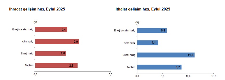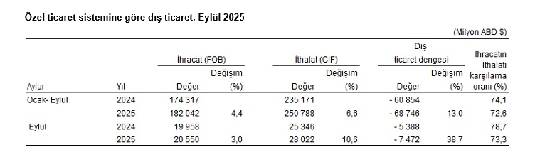 Özel ticaret sistemine göre, 2025 yılı Eylül ayında, ihracat bir önceki yılın aynı ayına göre yüzde 3,0 artarak 20 milyar 550 milyon dolar, ithalat yüzde 10,6 artarak 28 milyar 22 milyon dolar olarak gerçekleşti.