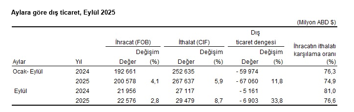 Ocak-Eylül döneminde dış ticaret açığı yüzde 11,8 artarak 59 milyar 974 milyon dolardan, 67 milyar 60 milyon dolara yükseldi. İhracatın ithalatı karşılama oranı 2024 Ocak-Eylül döneminde yüzde 76,3 iken, 2025 yılının aynı döneminde yüzde 74,9'a geriledi.