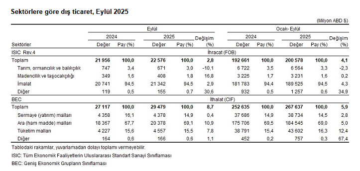Türkiye İstatistik Kurumu (TÜİK) verilerine göre, genel ticaret sistemine göre ihracat 2025 yılı Ocak-Eylül döneminde bir önceki yılın aynı dönemine göre yüzde 4,1 artarak 200 milyar 578 milyon dolar, ithalat yüzde 5,9 artarak 267 milyar 637 milyon dolar olarak gerçekleşti.