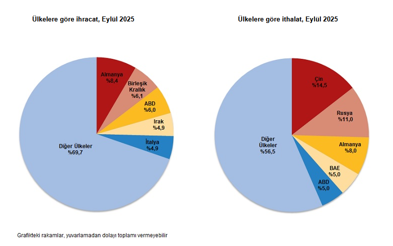 İthalatta Çin ilk sırayı aldı. Eylül ayında Çin'den yapılan ithalat 4 milyar 264 milyon dolar olurken, bu ülkeyi sırasıyla; 3 milyar 247 milyon dolar ile Rusya Federasyonu, 2 milyar 363 milyon dolar ile Almanya, 1 milyar 485 milyon dolar ile Birleşik Arap Emirlikleri, 1 milyar 465 milyon dolar ile ABD izledi. İlk 5 ülkeden yapılan ithalat, toplam ithalatın yüzde 43,5'ini oluşturdu.