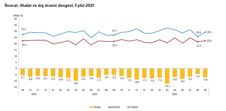 Eylül ayında dış ticaret açığı bir önceki yılın aynı ayına göre yüzde 33,8 artarak 5 milyar 161 milyon dolardan, 6 milyar 903 milyon dolara yükseldi. İhracatın ithalatı karşılama oranı 2024 Eylül ayında yüzde 81,0 iken, 2025 Eylül ayında yüzde76,6'ya geriledi.
