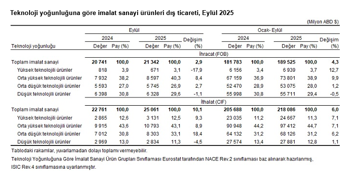 Teknoloji yoğunluğuna göre dış ticaret verileri, ISIC Rev.4 sınıflaması içinde yer alan imalat sanayi ürünlerini kapsamaktadır. Eylül ayında ISIC Rev.4'e göre imalat sanayi ürünlerinin toplam ihracattaki payı %94,5'tir. Yüksek teknoloji ürünlerinin imalat sanayi ürünleri ihracatı içindeki payı yüzde 3,1'dir. Ocak-Eylül döneminde ISIC Rev.4'e göre imalat sanayi ürünlerinin toplam ihracattaki payı yüzde 94,5'tir. Ocak-Eylül döneminde yüksek teknoloji ürünlerinin imalat sanayi ürünleri ihracatı içindeki payı yüzde 3,7'dir.