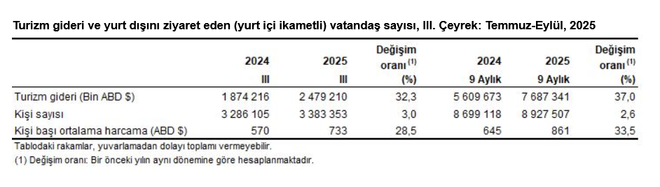 Türkiye'den çıkış yapan ziyaretçi sayısı 2025 yılı III. çeyreğinde bir önceki yılın aynı çeyreğine göre yüzde 1,9 artarak 23 milyon 639 bin 736 kişi oldu. Ziyaretçilerin yüzde 14,5'ini 3 milyon 438 bin 655 kişi ile yurt dışında ikamet eden vatandaşlar oluşturdu.